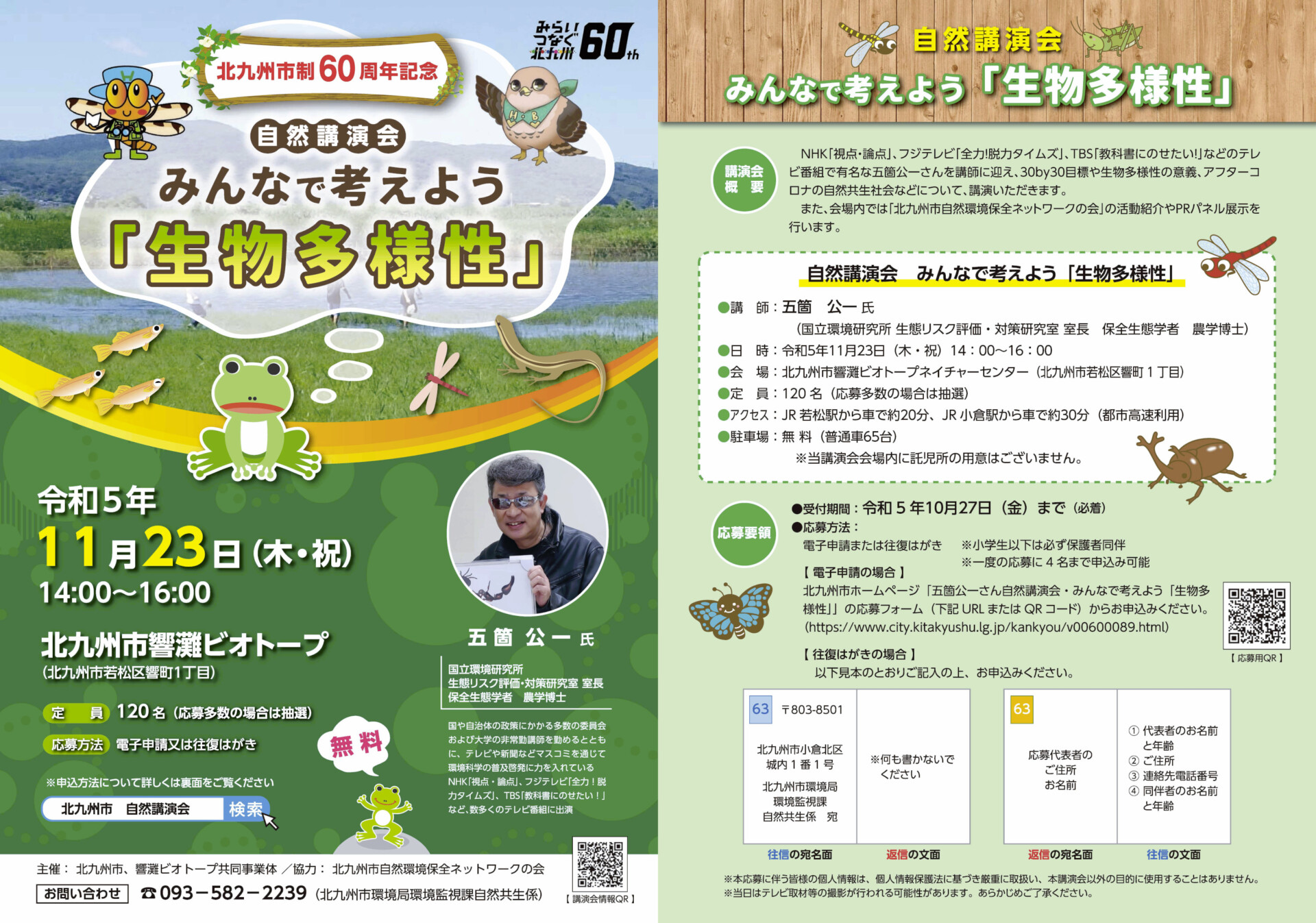 国立環境研究所 生態リスク評価・対策研究室 室長の五箇公一さんを講師にお迎えして、30by30目標や生物多様性の意義、アフターコロナの自然共生社会などについて講演していただきます また、会場内では「北九州市自然環境保全ネットワークの会」の活動紹介やPRパネル展示を行います。参加をご希望の方は画像の応募要領をご覧ください。
