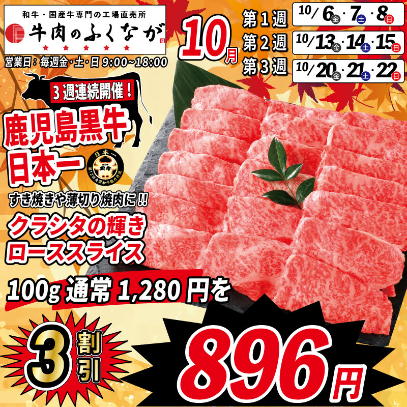 すっかり秋らしくなった週末の晩御飯に、鹿児島黒牛黒毛和牛のローススライスを使ってすき焼きや焼き肉はいかがでしょうか?3週間連続でセールしてますのでぜひご来店お待ちしております。