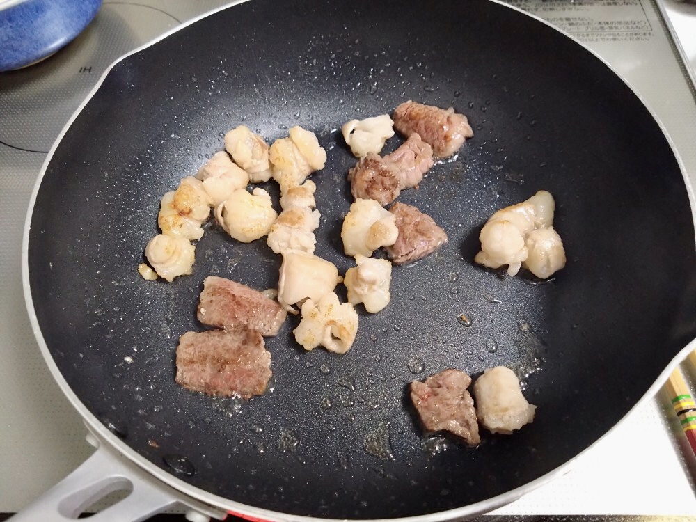 丸腸は炒めてもぷりぷりトロトロでスーッと溶ける感じ、一方のカルビーは絶妙な脂配分で柔らかく、これもとろける食感。最高のタッグ、ハーモニー。食感が2種あることで味わい深い一品になりました。