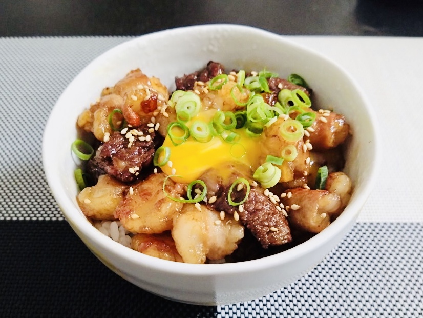 そして、丸腸を使ったもう一品は特製丼。共に購入した「絶品ふくなが牛の牛カルビ―」と「絶品タレ」も使い、某有名ホルモン飲食店のメニューを見よう見まねで再現してみました。