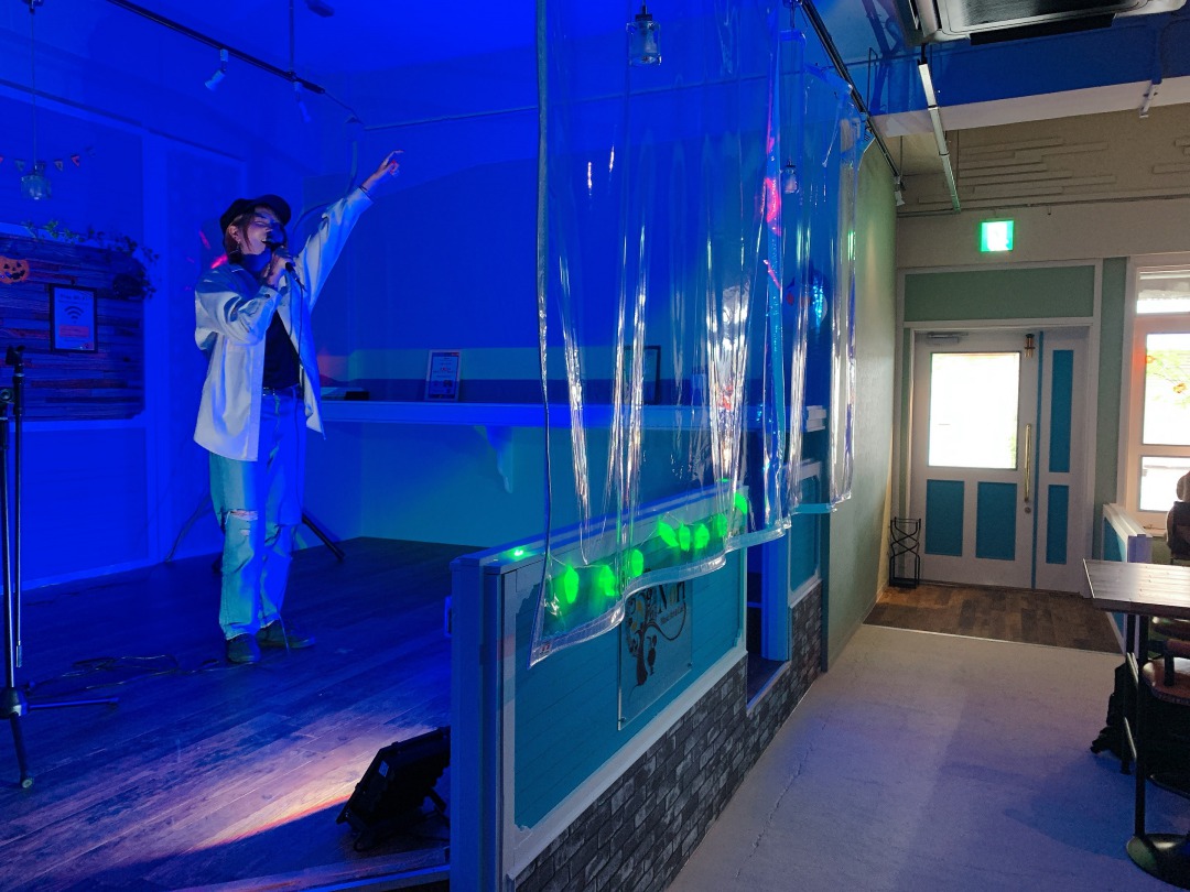カフェスペースにあるステージや、お会計の窓口、防音になっているボイストレーニング室は、全てビニールカーテンで飛沫感染防止対策も行われており、安心できる環境づくりを行っています。