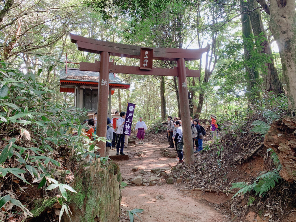 11時から上宮で神事が執り行われるとのことで、朝9時に戸上神社へ集合。戸ノ上山への経路はいくつかあるのですが、今回は神社近くの寺内登山口から登りはじめ、所々休憩をはさみつつ、約1時間ほどで、山頂へ到着しました。