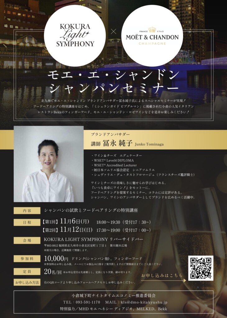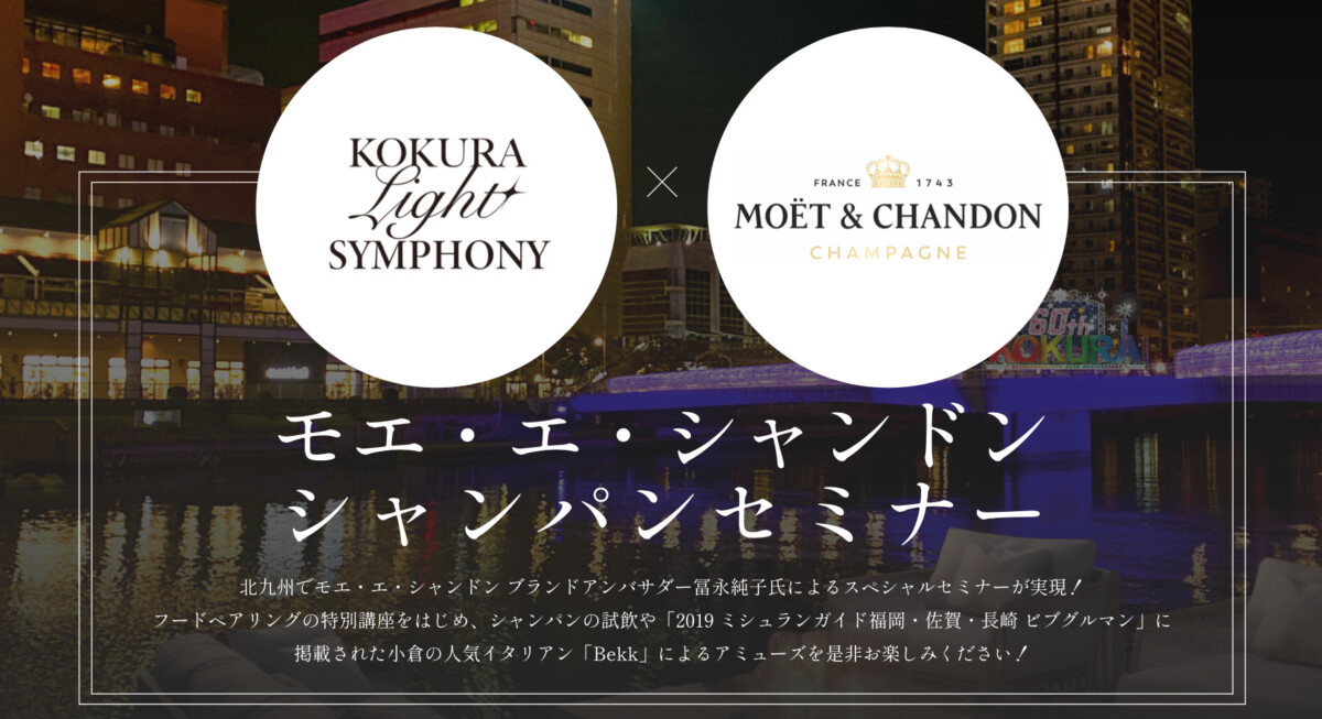 モエ・エ・シャンドン シャンパンセミナーは、小倉のまちを鮮やかに彩り、夜間に楽しめるナイトタイムエコノミーを創出する「KOKURA LIGHT SYMPHONY(小倉ライトシンフォニー)」の一環イベント。「KOKURA LIGHT SYMPHONY」は2023年秋、平成中村座小倉城公演に合わせ、小倉城周辺〜紫川一帯を光の演出に包むプロジェクトで、「小倉城 竹あかり」や「小倉イルミネーション」など周辺イベントと連携しながら、“小倉の夜”を盛り上げます。