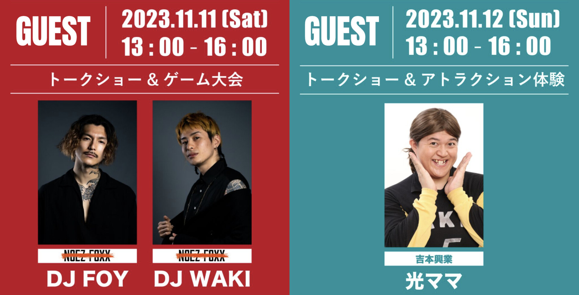 11日はゲーミングチーム「NOEZ FOXX」より、DJ FOYさん、DJ WAKIさんがゲスト出演し、eスポーツをテーマとしたトークショーやゲーム実況、ゲーム対戦会を実施します。