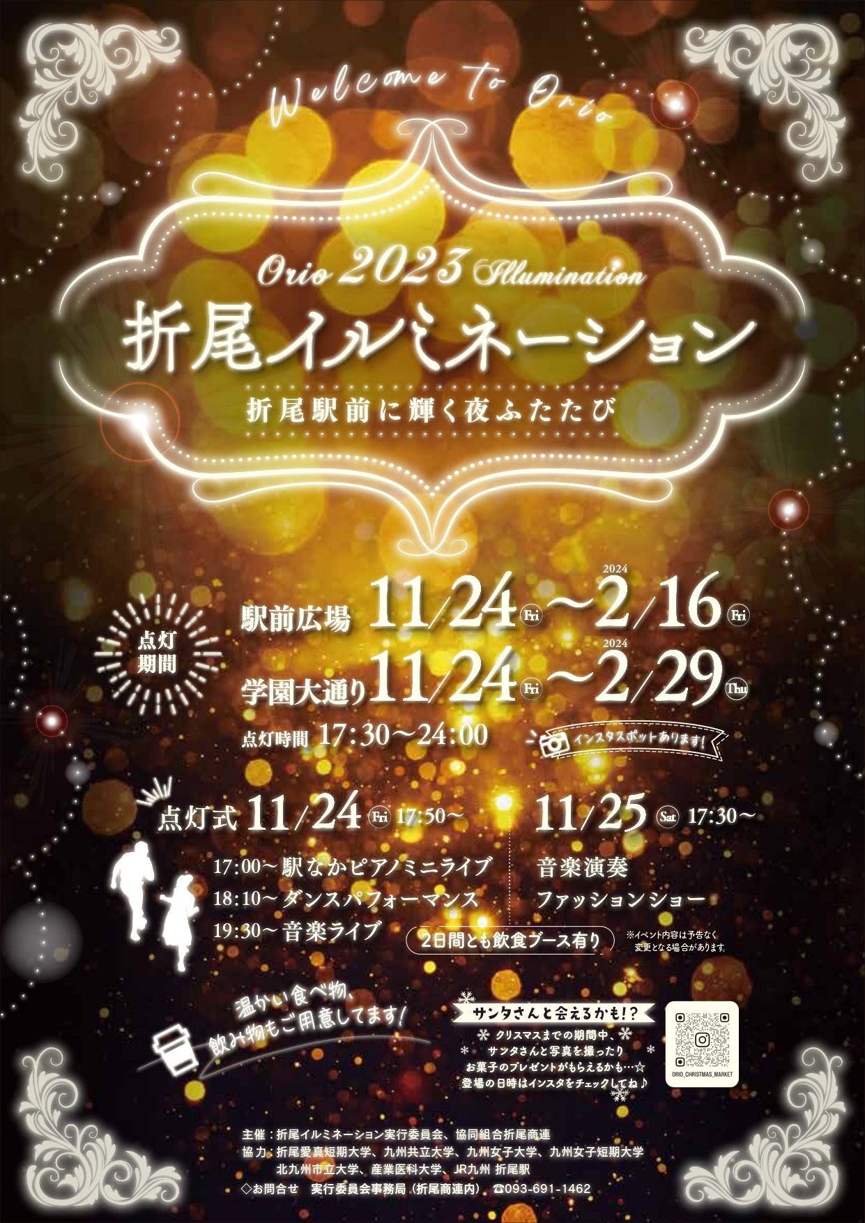 11月24日には、折尾駅北側駅前広場にて点灯式が開催され、音楽ライブやダンスパフォーマンスも実施。25日は、音楽演奏やファッションショーが行われます。両日とも飲食ブースで温かい飲み物や食べ物も販売するそう。イルミネーションと合わせて、グルメも楽しめそうです。