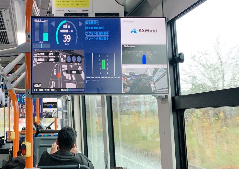 自動運転バスには、モニターが2か所設置されており、運転席のハンドルが見える映像や速度が表示されます。