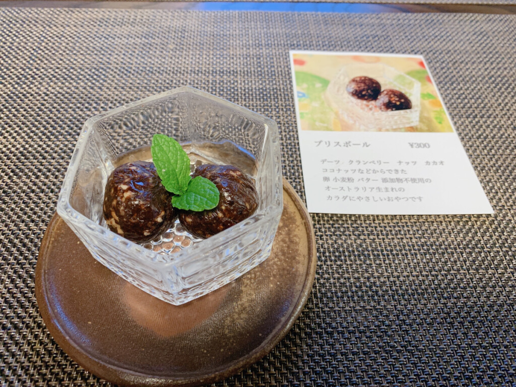 カフェを始めた当初は、全くの素人で演奏よりも料理を提供することの方が緊張していたというなかむらさんですが、今では以前から提供したいと思っていた「発芽酵素玄米のごはん(発芽玄米に小豆と塩を加えて炊き熟成させた幸せごはん)」や、「ブリスボール(オーストラリア発祥のロースイーツ)」などもカフェのメニューに。