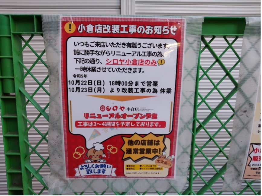 シロヤ小倉店が改装工事のため10月23日より臨時休業に入りました。