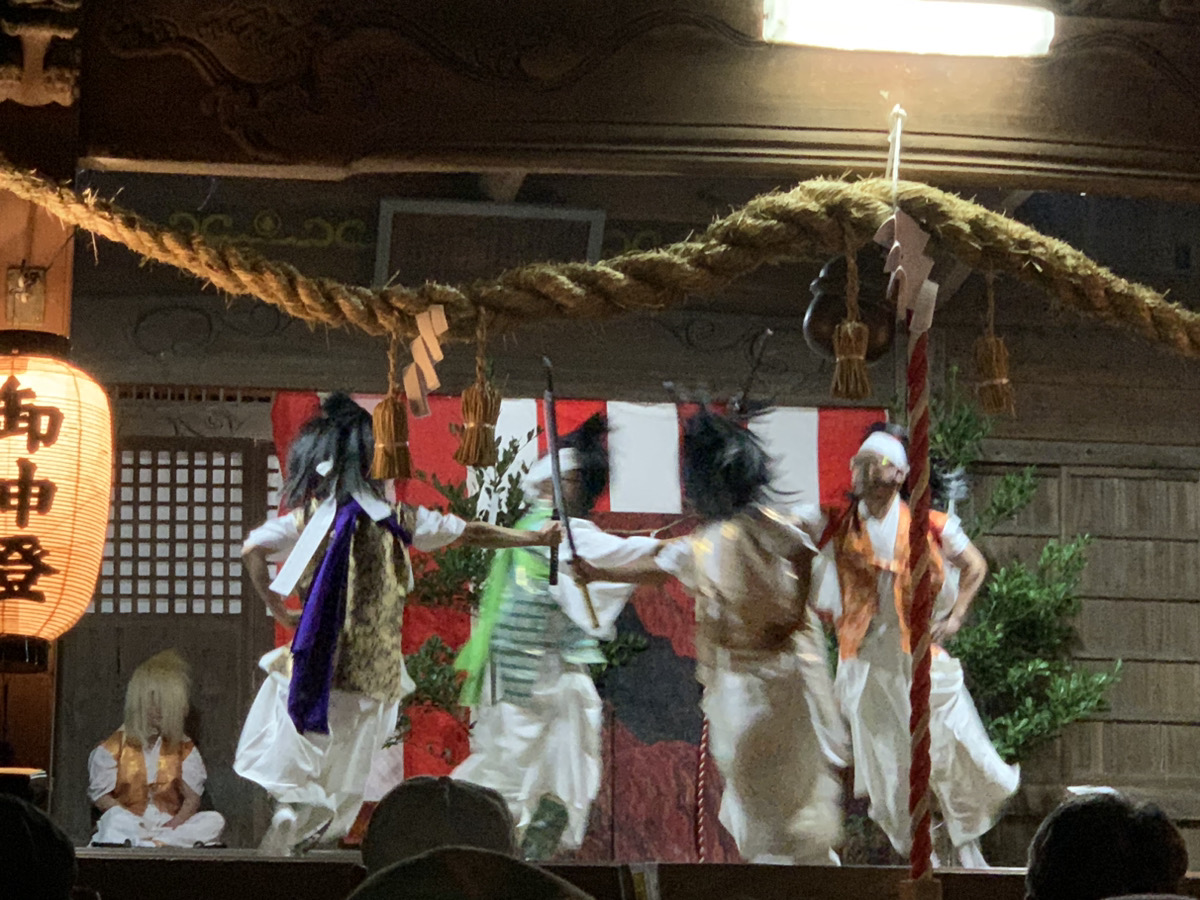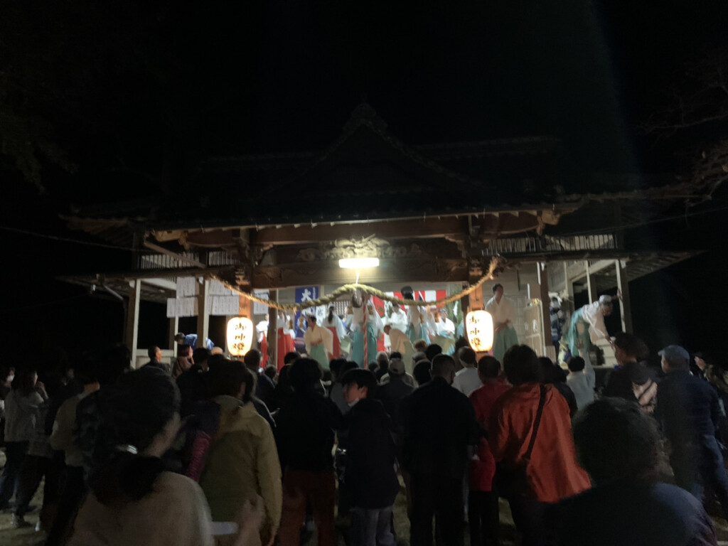 5つ目の演目の「御先神楽」の途中で、鬼のような面の神様たちが幼子を抱きかかえる場面があり、恐怖で泣きわめく幼子が続出。御先の神に抱かれた幼子は1年間無病息災で過ごすという縁起があることから、泣く子を抱えて順番を待つ親御さんや祖父母の姿が微笑ましく感じました。