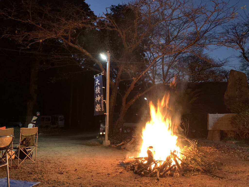 日中は暖かい日が差す穏やかな天気でしたが、だんだんと日が暮れる中、境内は凛とした空気に包まれていました。焚火のぱちぱちと爆ぜる音、木の香り、夕闇に映える神社の灯りがとても美しく感じられました。