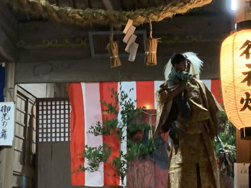 5つ目の演目の「御先神楽」の途中で、鬼のような面の神様たちが幼子を抱きかかえる場面があり、恐怖で泣きわめく幼子が続出。御先の神に抱かれた幼子は1年間無病息災で過ごすという縁起があることから、泣く子を抱えて順番を待つ親御さんや祖父母の姿が微笑ましく感じました。