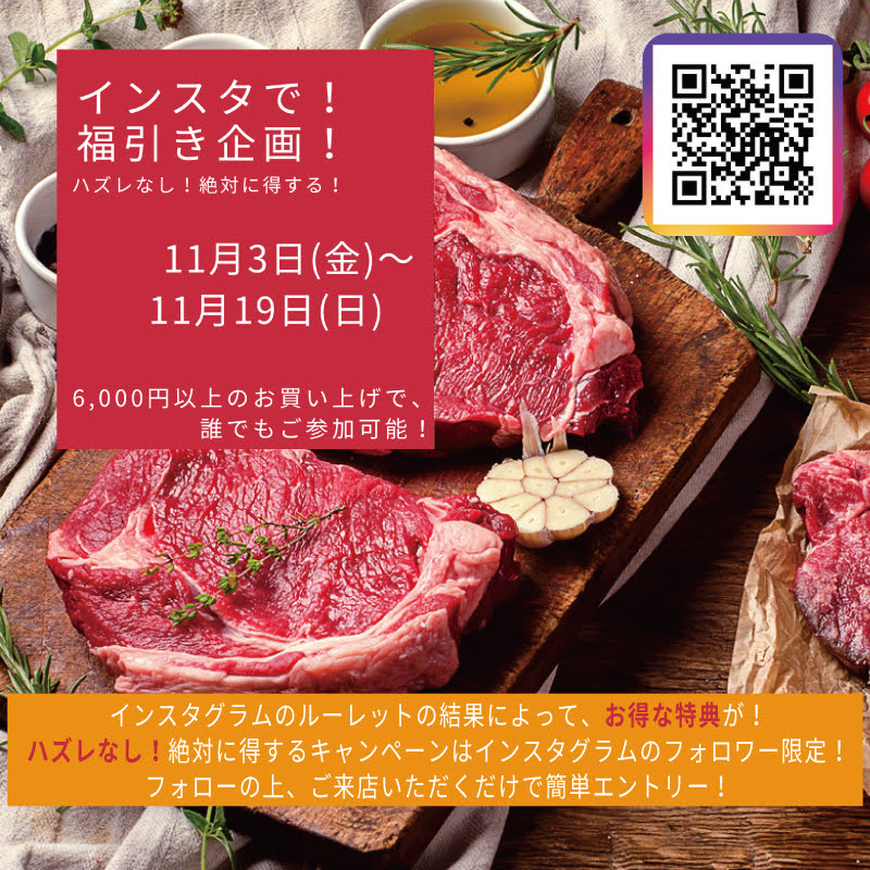 牛肉のふくながはInstagramでもいろいろお得な企画をしています!牛肉のふくながのフォロワーになって、お会計時にルーレットをしてもらうと、止まった所で割り引き!お得にお買い物をしてください!