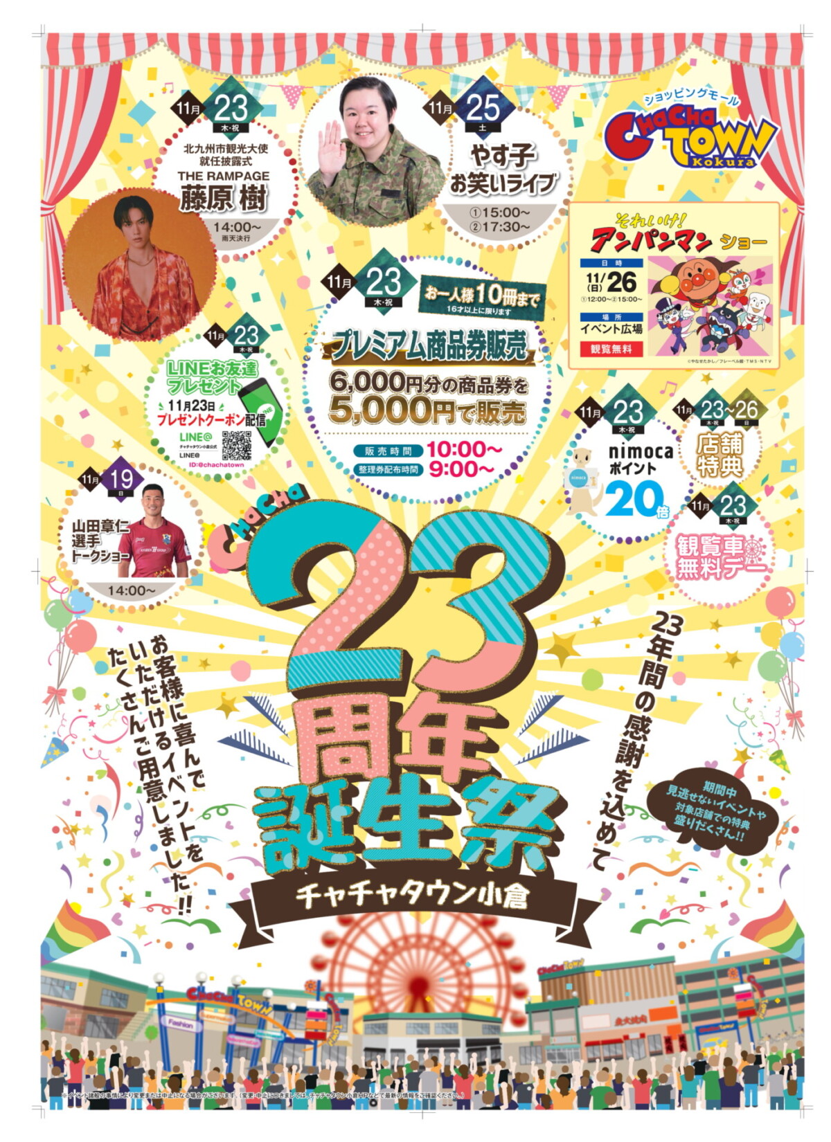 チャチャタウン小倉(北九州市小倉北区砂津3-1-1)は2000年11月23日に開業し、今年で23周年を迎えます。それを記念して、11月23日から4日間、「23周年誕生祭」が開催されます。