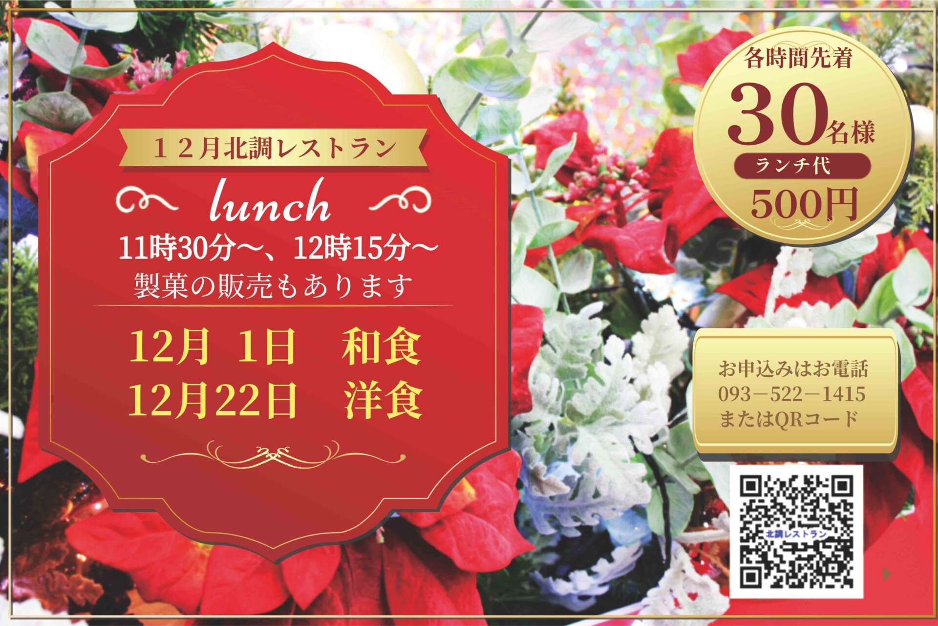 北九州調理製菓専門学校で開催される大好評の北調レストランのご案内です。12月は1日と22日に開催します。11時30分と12時15分の各回30食限定となっております。定員になり次第締め切りとなります。ご予約はお電話093-522-1415、または添付QRコードから。皆様のご来店お待ちしております。
