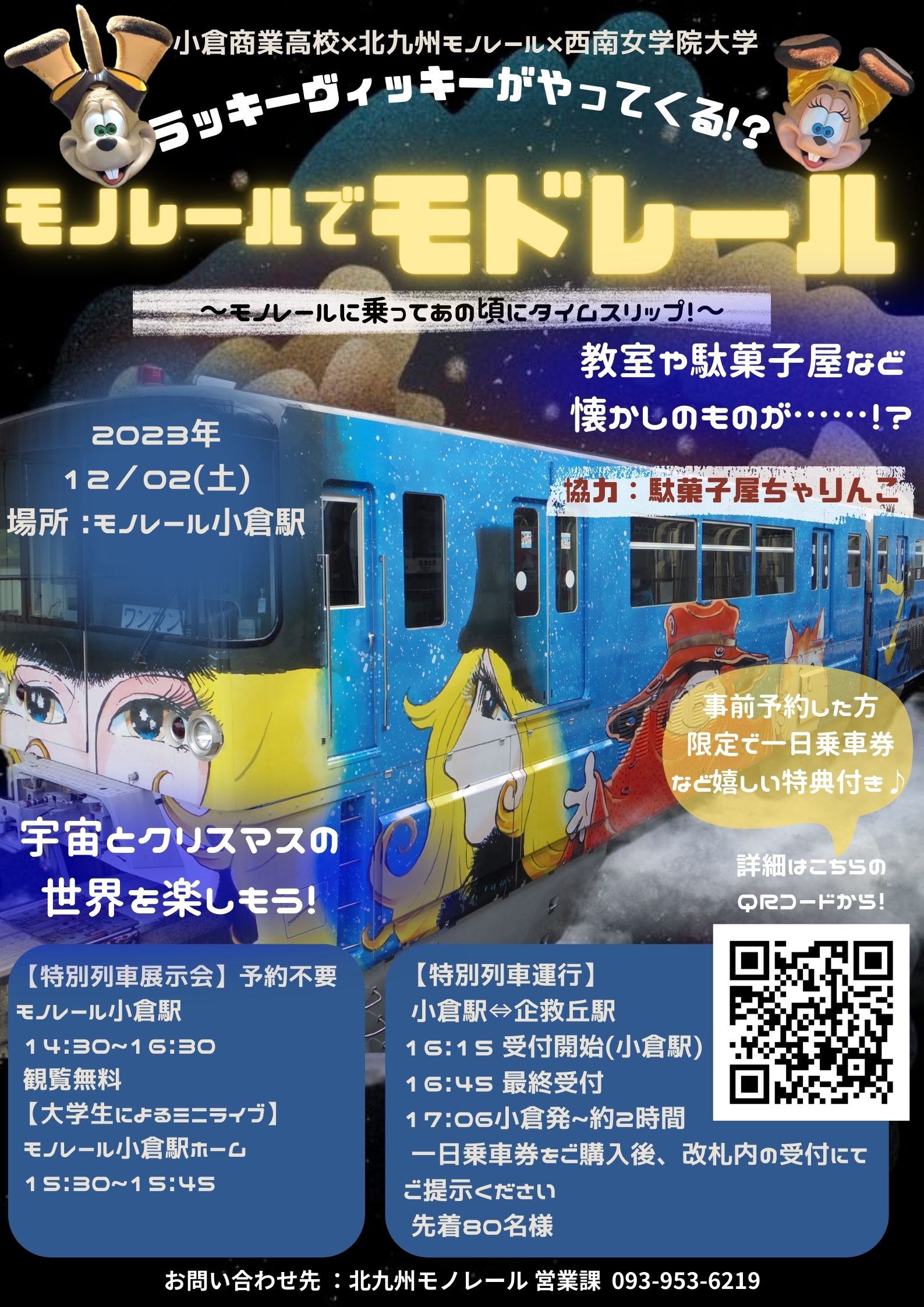 北九州モノレールでは、昨年より、西南女学院大学、小倉商業高校と連携した「つなぐヒカリプロジェクト」を実施しています。 今年のテーマは、”モノレールに乗ってあの頃にタイムスリップ! あのラッキー&ヴィッキーが宇宙から” で、12月2日に一夜限りの特別列車運行を行います。その名も「モノレールでモドレール」。 懐かしいものに触れながら自分たちの過去を思い出してもらい、次の新しい自分に繋げていってほしいという想いが込められています。