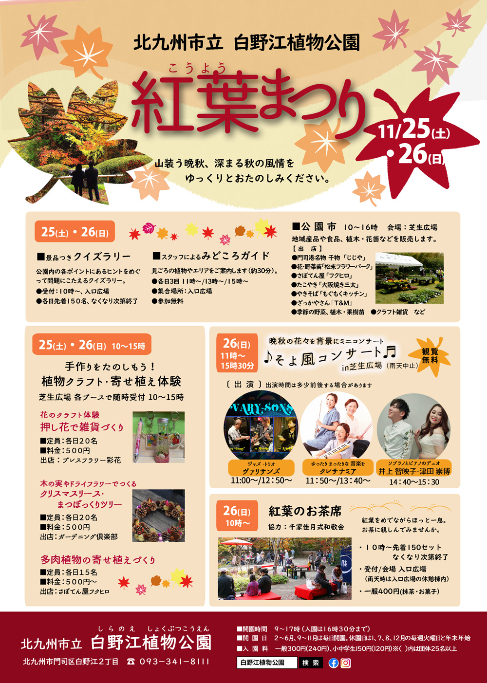 門司区の東側・周防灘をのぞむ小高い丘に広がる白野江植物公園では、11月下旬から12月上旬にかけて約800本のモミジが色づき、紅葉の見ごろを迎えます。それに合わせた「紅葉まつり」では、食品や雑貨の販売、スタッフによる園内ガイド、お茶席やミニコンサートなど深まる秋の自然を楽しむ様々なイベントを開催します。紅葉の見ごろは11月25日頃から12月上旬です。