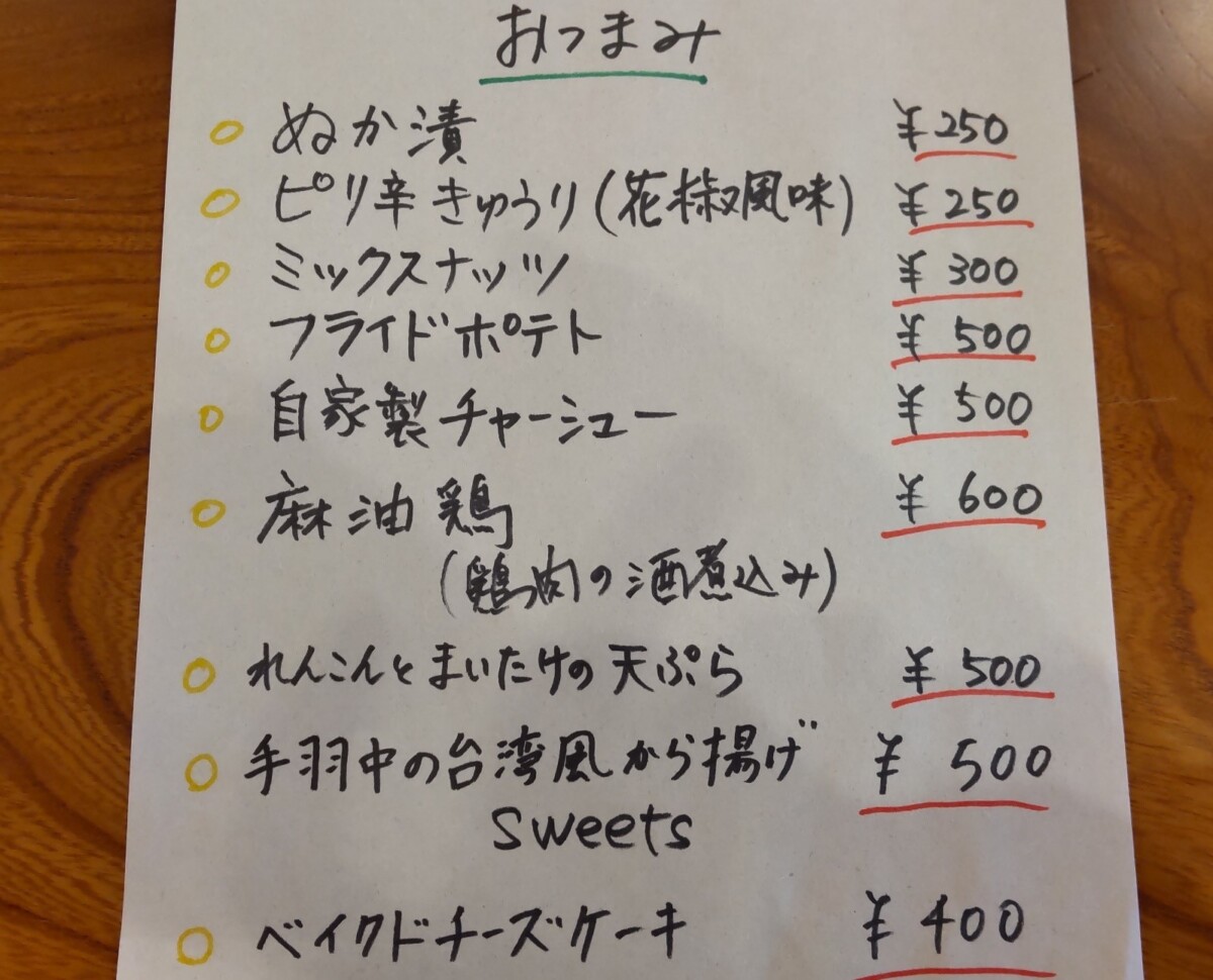 お店は日中から開いているので、昼飲みも楽しむことができます。また、アルコール以外のドリンクもあり、カフェとしての利用もできそうです。和紅茶やコーヒー、オーガニックジュースといった各種ドリンクと、チーズケーキや黒糖ふくれなどのスイーツも味わえます。