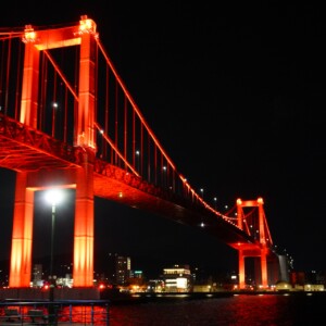 洞海湾沿いの若松南海岸通りでは、日本遺産に登録されている旧古河鉱業若松ビルや若戸大橋のライトアップを背景に美しいイルミネーションを見ることができます。