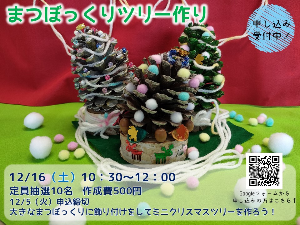 「まつぼっくりツリー作り」イベントの参加者を募集中です。大きなまつぼっくりに飾り付けをしてミニクリスマスツリーを作ろう! 応募はこちらから(https://forms.gle/QBBPsfgjSh7qbRMJ7)