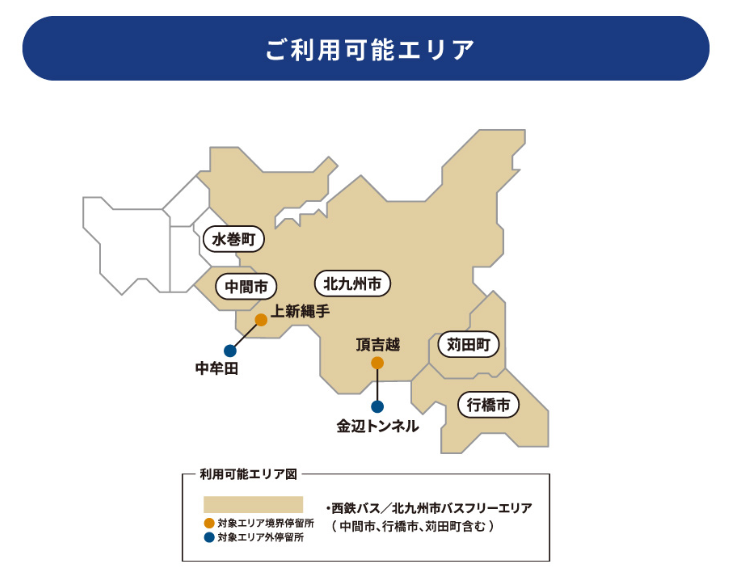 利用可能エリアには、中間市、行橋市、苅田町なども含まれます。また、高速バス・北九州空港エアポートバスなどには利用できないため注意が必要です。