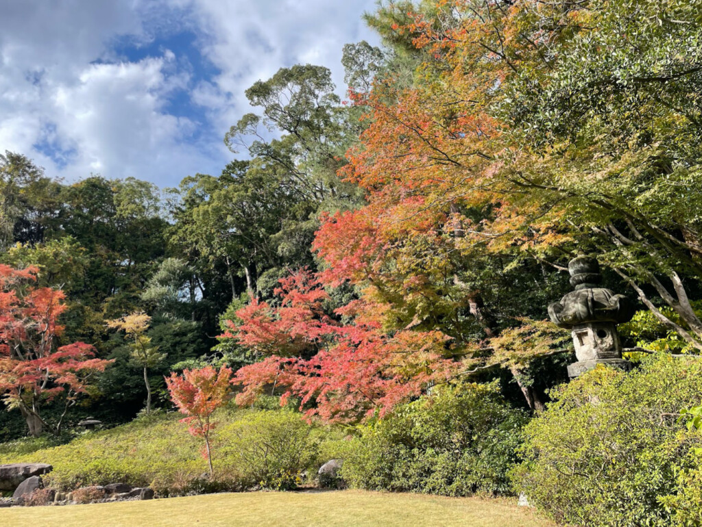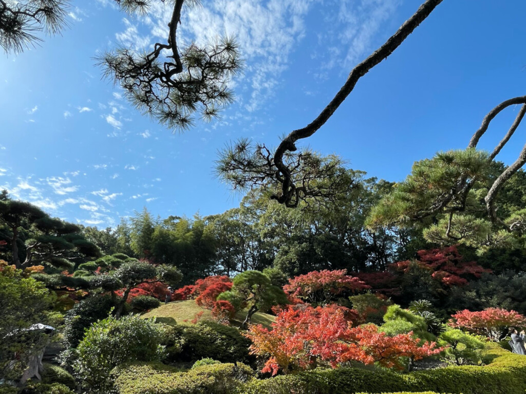 左手には、赤い紅葉と緑の木々の色合いがとても綺麗な庭園があります。
