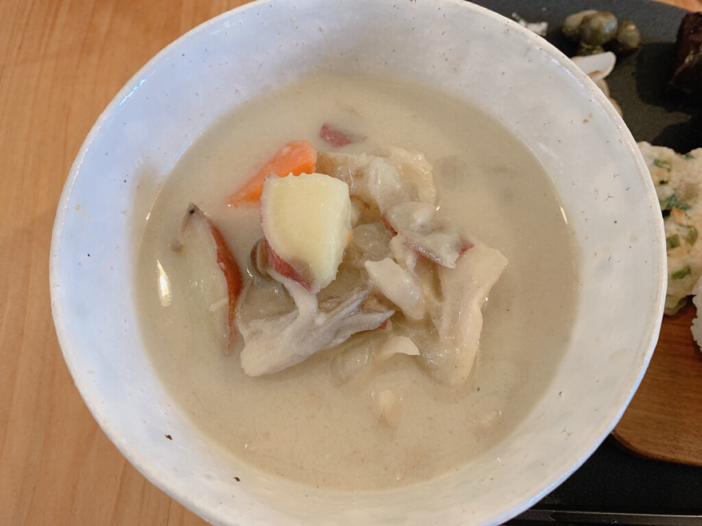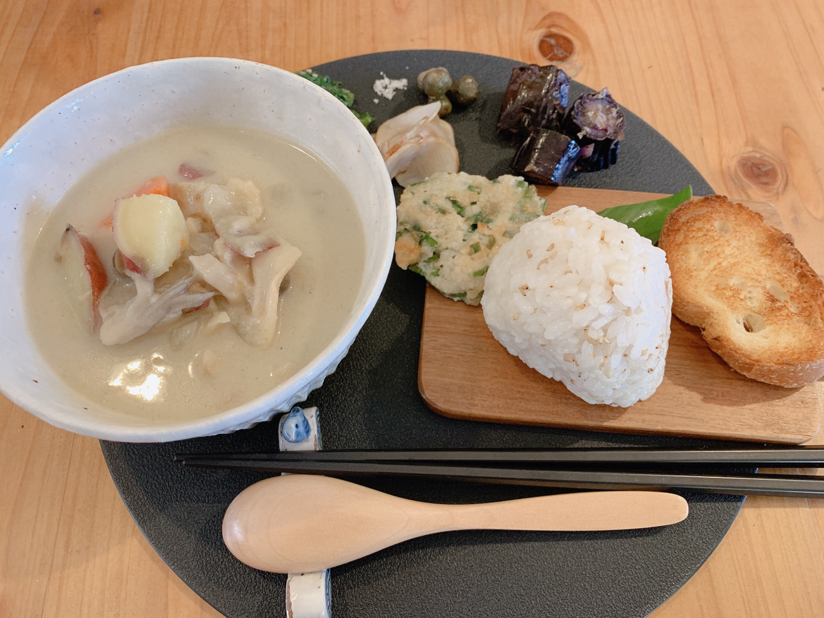 この日のスープは、さつまいもやきのこ、にんじん、玉ねぎ、黒豆枝豆の入った豆乳仕立てのスープ。程よい大きさのごろごろお野菜は食べ応えがあり、<食べるスープ>といった感じです。