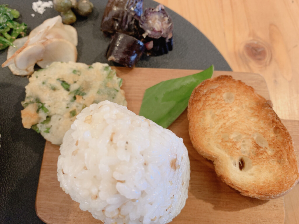 新米で炊いたおにぎりとパン、お野菜のお惣菜が添えられています。その日の気候や季節にあわせたハーブティーがセットになっているのも嬉しいポイント。