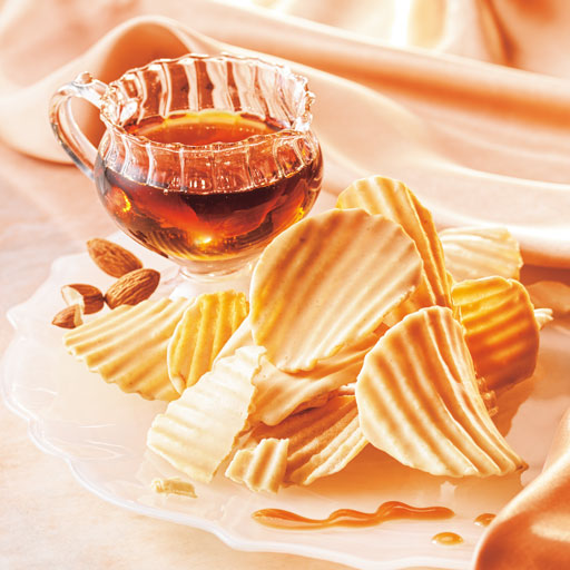 「ポテトチップチョコレート<メープルナッティ>」は、メープルシュガーとアーモンドプラリネペーストを加えたチョコレートを、ポテトチップの片面にコーティングしたもの。ポテトチップの塩気とメープルシュガーの風味のバランスが絶妙なんだそう。後味にほんのりナッツが香ります。