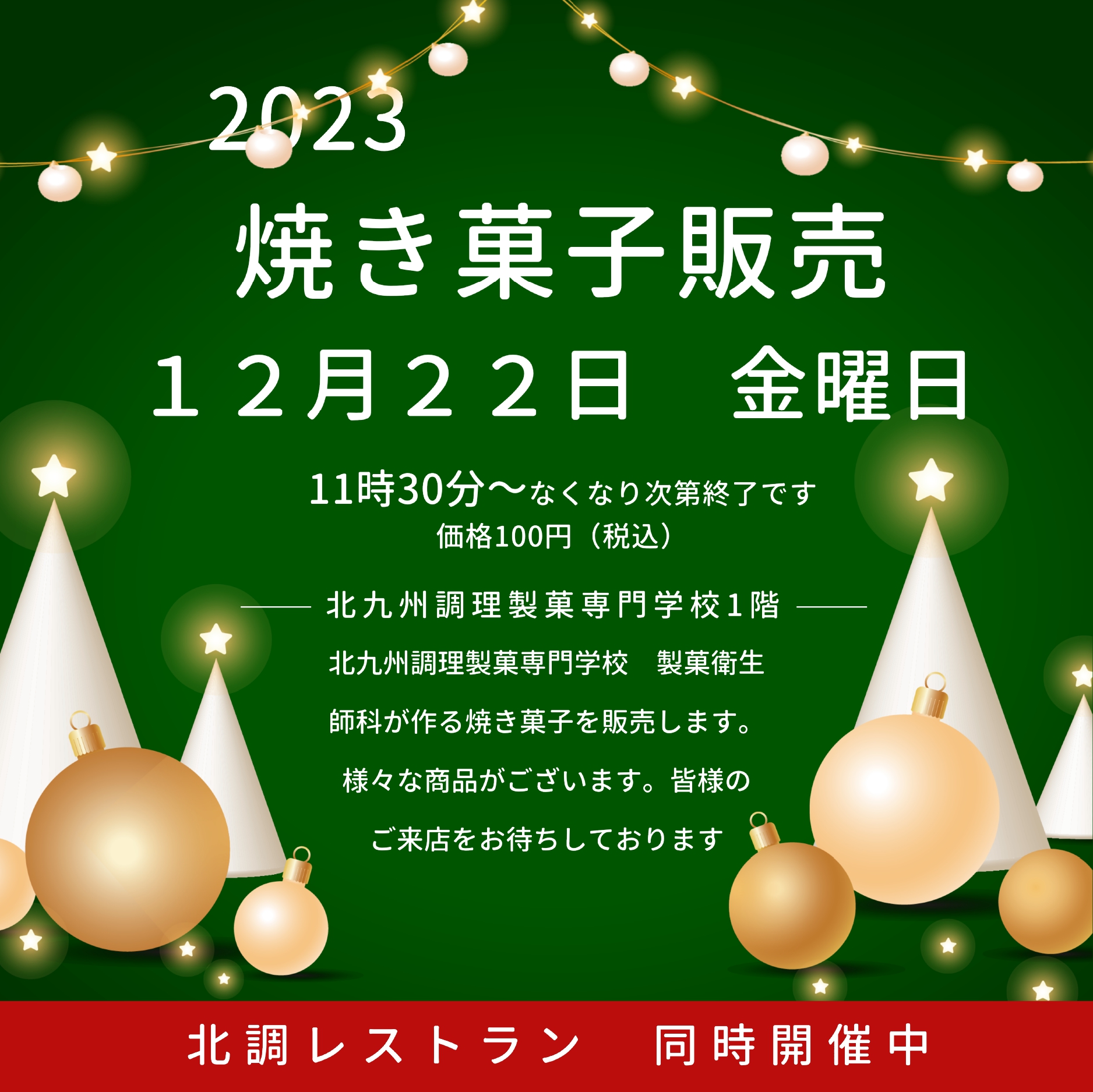 北九州調理製菓専門学校では、「製菓衛生師科が作る焼き菓子」を12月22日に販売します。午前11時30分から午後1時30分までの販売となりますが、数量限定で”なくなり次第終了”となります。この機会にぜひ、北九州市の専門学校で唯一の調理師・製菓衛生師養成施設にお立ち寄りください。お来店お待ちしております。