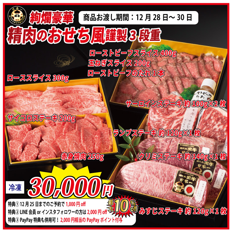 今年一年の締めくくりに、絢爛豪華なお肉の盛り合わせはいかがでしょうか?鹿児島黒牛を3段重おせち風に盛り込んでいます。PayPayお支払いで2000ポイント還元キャンペーンでお得に購入できます。