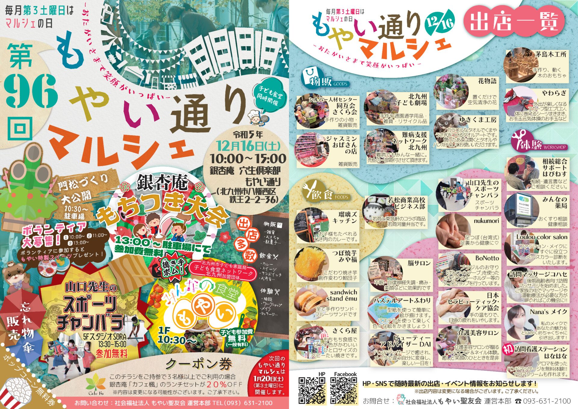 八幡西区鉄王の「銀杏庵 穴生倶楽部」で、12月16日に”もやい通りマルシェ”が行われます。毎月恒例のスポーツチャンバラ、こども食堂、駄菓子や雑貨の販売、ワークショップ、スイーツ、サンドイッチなどの出店に加えて、「もちつき大会」「門松づくり」「忘れ物傘販売」を開催!赤ちゃんからパパ・ママ、だれでも楽しめること間違いなしの”もやい通りマルシェ”へぜひお越しください。