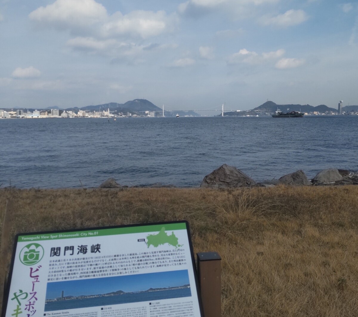 島からは真正面に関門橋を、両岸に門司港と下関の海峡ゆめタワーも見えますよ。