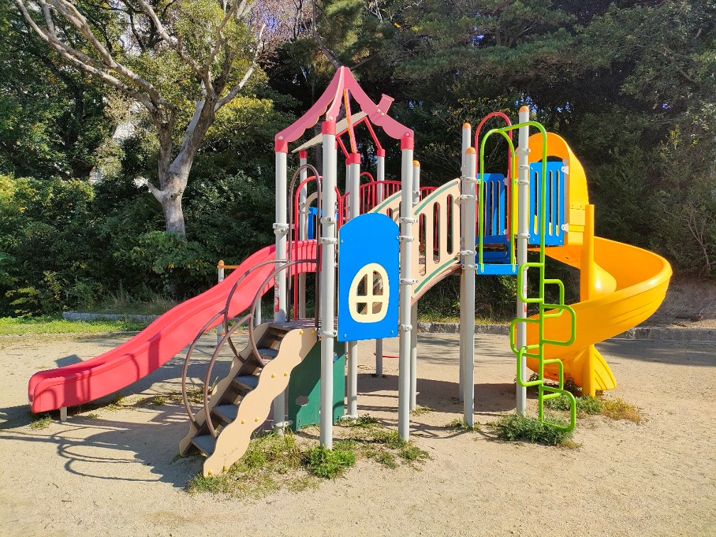 メインの子ども用遊具は長めのすべり台や螺旋のすべり台があり楽しそう。色使いやデザインも、とても可愛いなという印象を受けました。