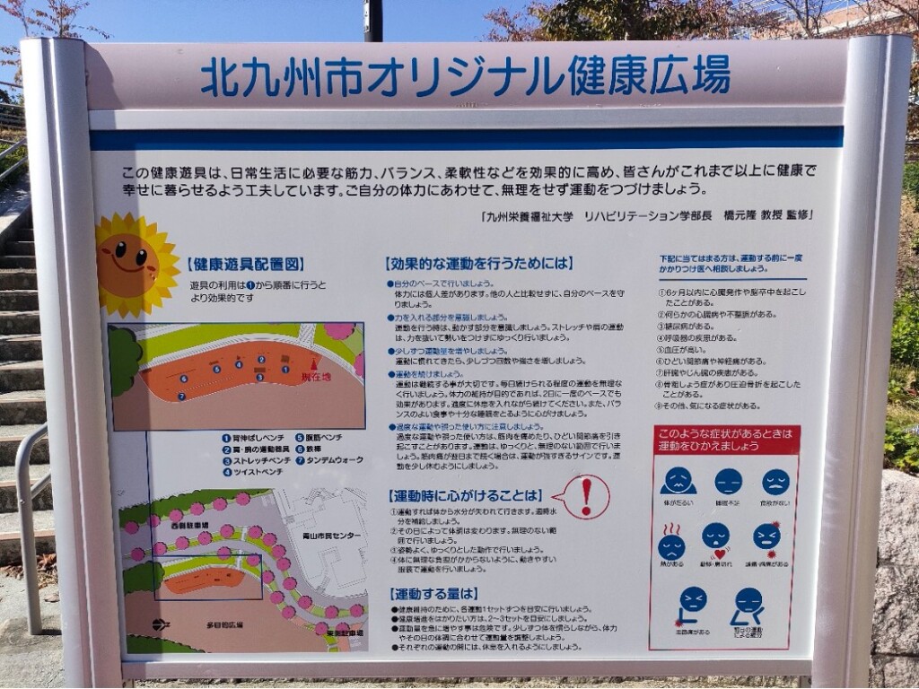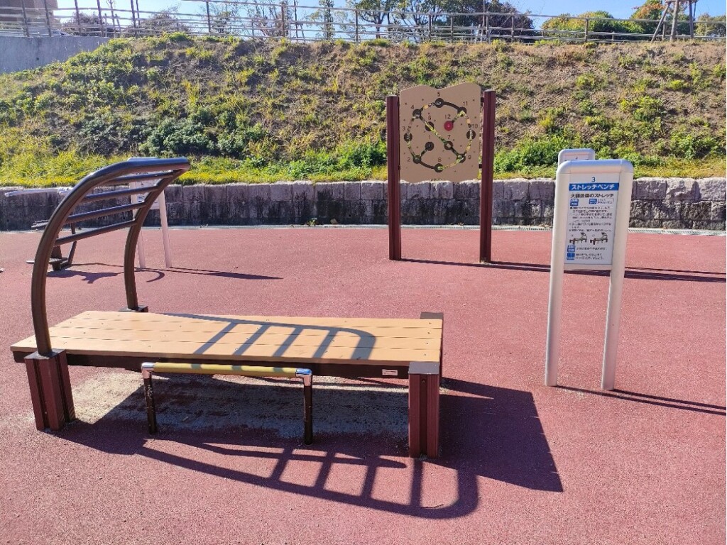 ここには「背伸ばしベンチ」「肩・腕の運動器具」「ストレッチベンチ」「ツイストベンチ」「腹筋ベンチ」「鉄棒」「タンデムウォーク」が用意されており、7種類の運動ができるようになっています。健康広場の遊具は、九州栄養福祉大学リハビリテーション学部長教授の監修です。