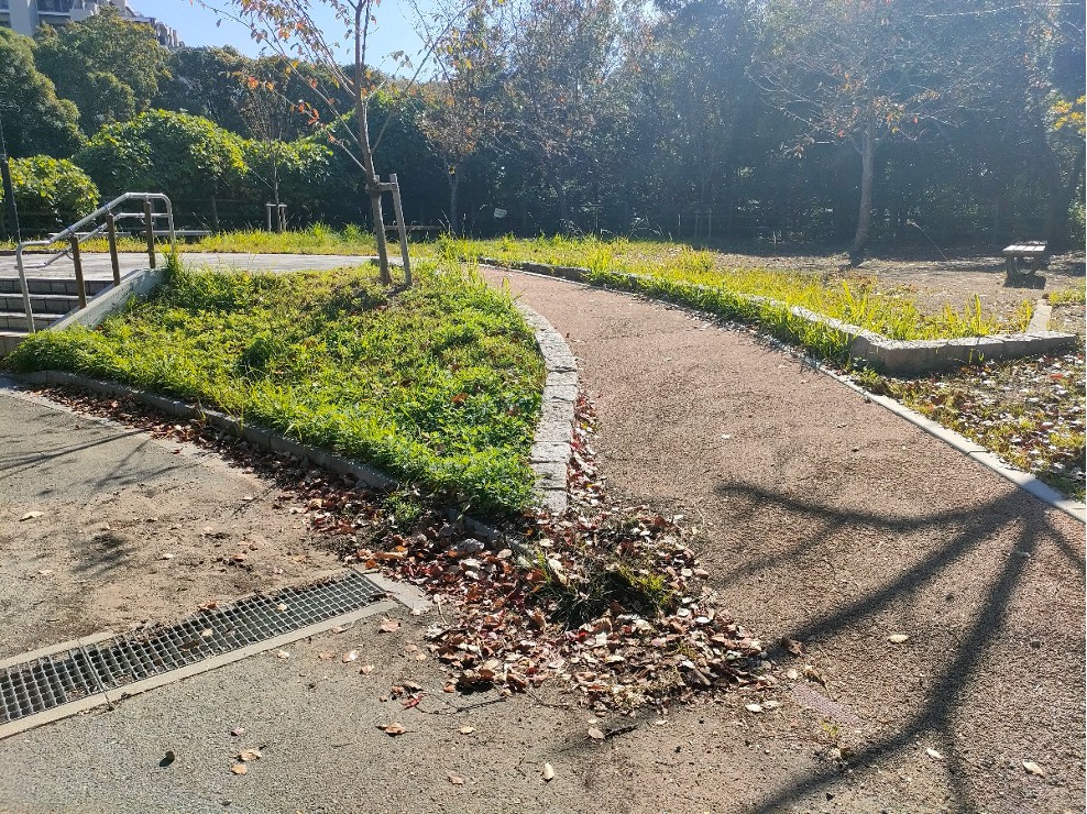子ども用遊具、健康遊具がある広場から階段を上がると歩道があります。木々に囲まれ緑も多いですが、歩道は広めで歩きやすく散歩やウォーキングに最適です。