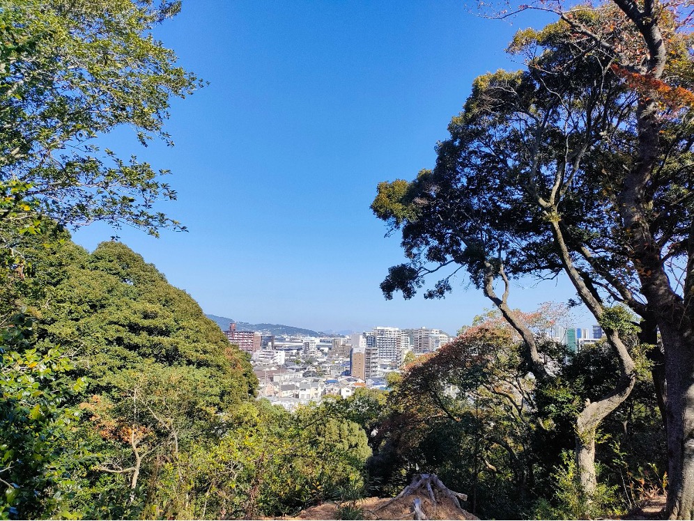 少しずつ坂を登って進んで行くと、広がる景色に驚きました。木々の間から街並みが見え、遠くの山もきれいに見えます。筆者が訪れたのは11月上旬の暖かく天気の良い日だったので、とてもきれいな景色を見ることができ、ちょっとしたハイキング気分を味わえました。