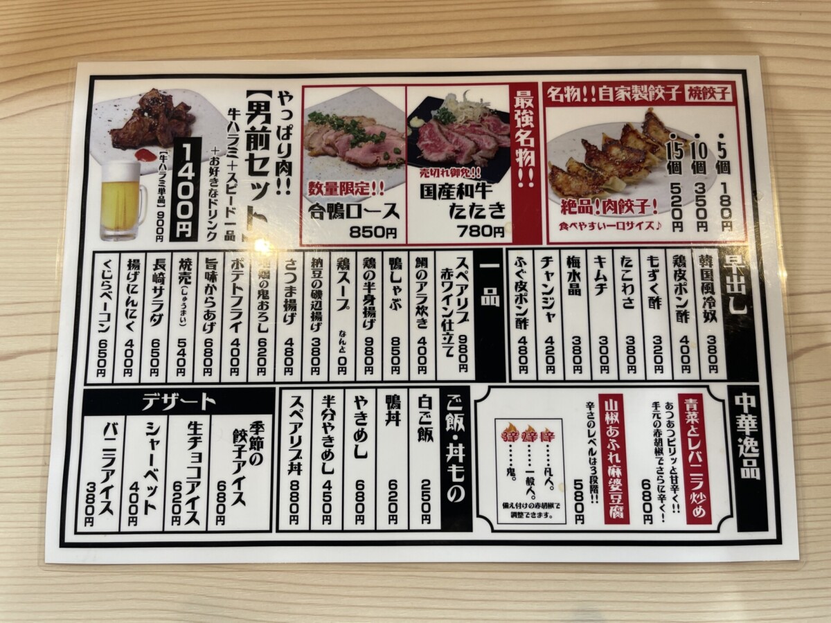 店名にある「鴨そば」や「餃子」はもちろん、他にもお手軽な価格の肉料理やお酒も楽しめます。「大衆酒場」とありますが、昼営業もしているとのことで、今回はランチタイムに行きました。