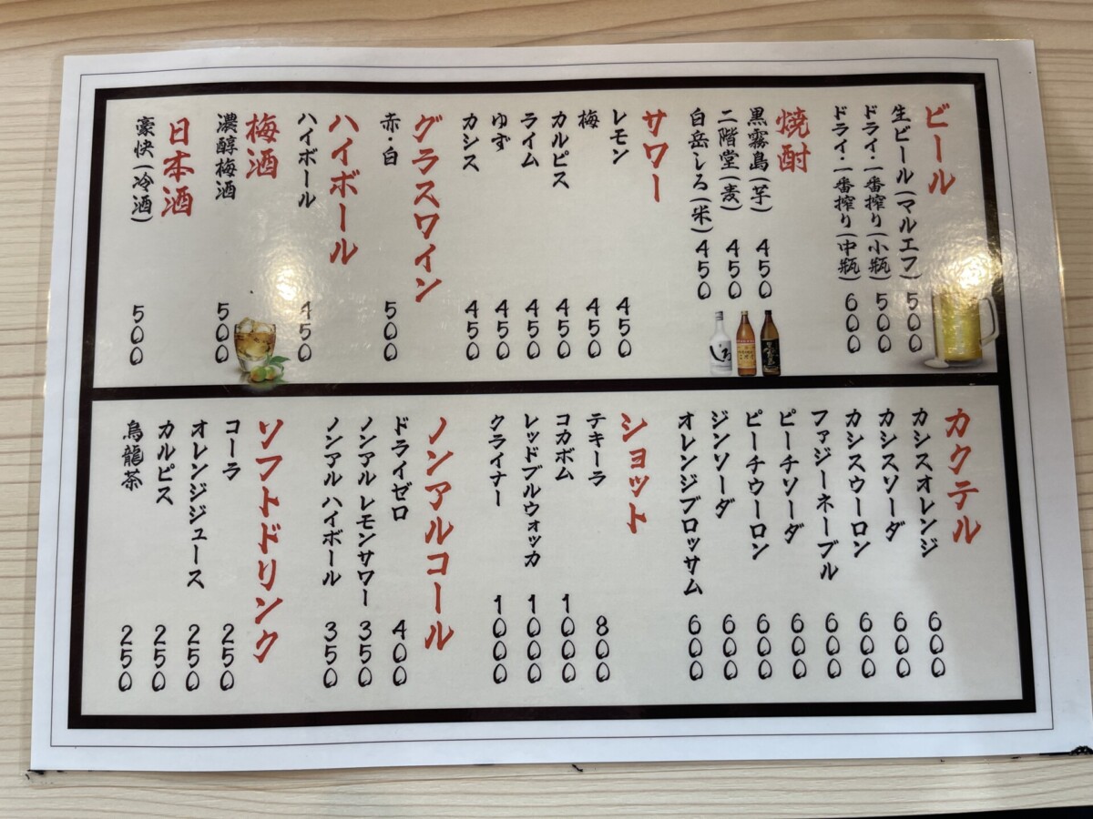ドリンクメニューは、ビールやサワー、ショットメニューからノンアルコールまで種類が豊富でした。