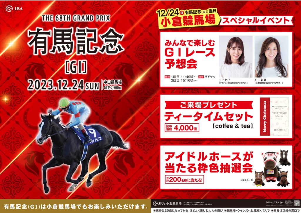 毎年12月に開催される「有馬記念」ですが、今年は24日(クリスマスイブ)に開催。当日は小倉競馬場でもイベントや来場者プレゼントが実施されます。競馬場内にはクリスマススポットもスポットもありますよ!