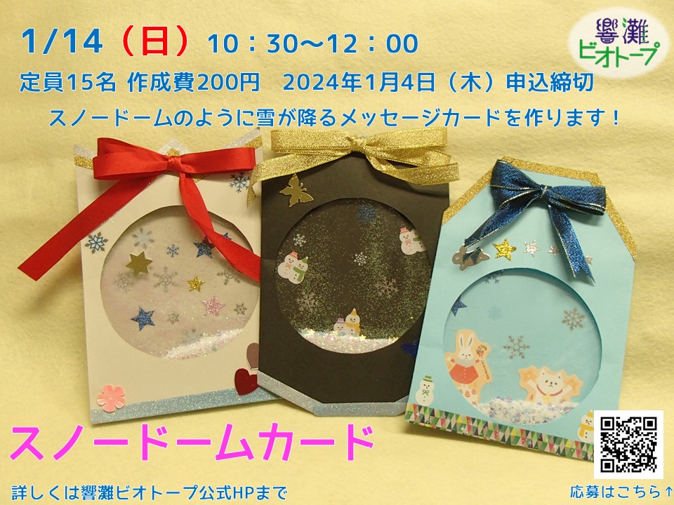 スノードームのように雪が降るメッセージカードを手作りしてみませんか? 詳しい内容は響灘ビオトープHPをご覧ください。申し込みはこちらから(https://forms.gle/XsgFimVnFQwWU55MA)