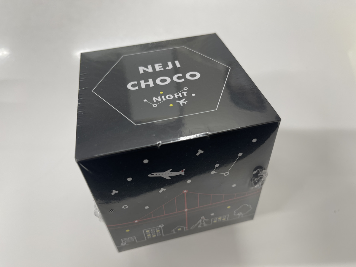 「ねじチョコは」、紺色の箱に<NIGHT>の文字。ねじチョコの形をした星が描かれ、飛行機など北九州市の夜景をかわいらしく絵で表現しています。