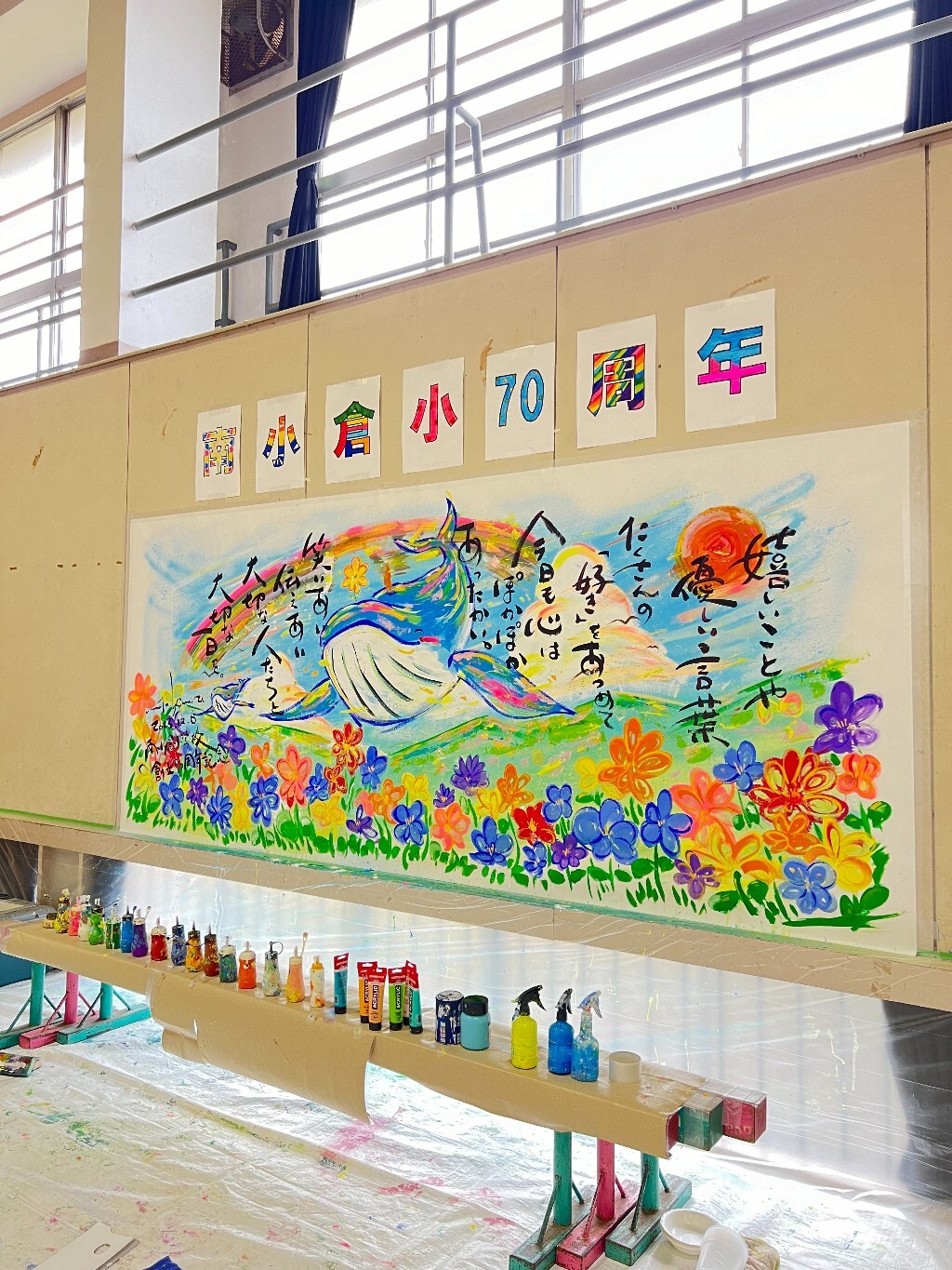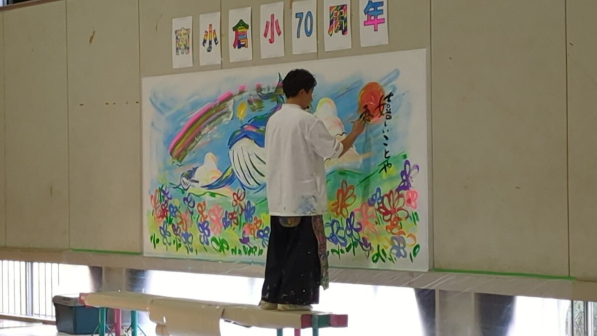 12月6日、北九州市出身の詩人・画家である木村詩太(きむらうーた)さんが、自身の母校でもある北九州市立南小倉小学校で行われた「創立70周年記念式典」で、ライブペイントを披露しました。