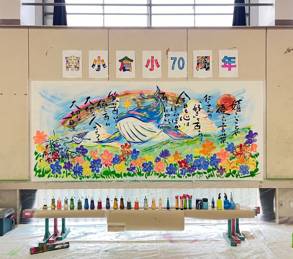 ほんの1時間前まで真っ白だったキャンバスには、虹を駆ける大きなクジラの親子と、心を打つメッセージ。児童たちに作品のタイトルを聞かれた詩太さんは、「どうしようかな。『空飛ぶクジラと心ぽかぽか』とかどうかな」と少し照れくさそうに答えていました。
