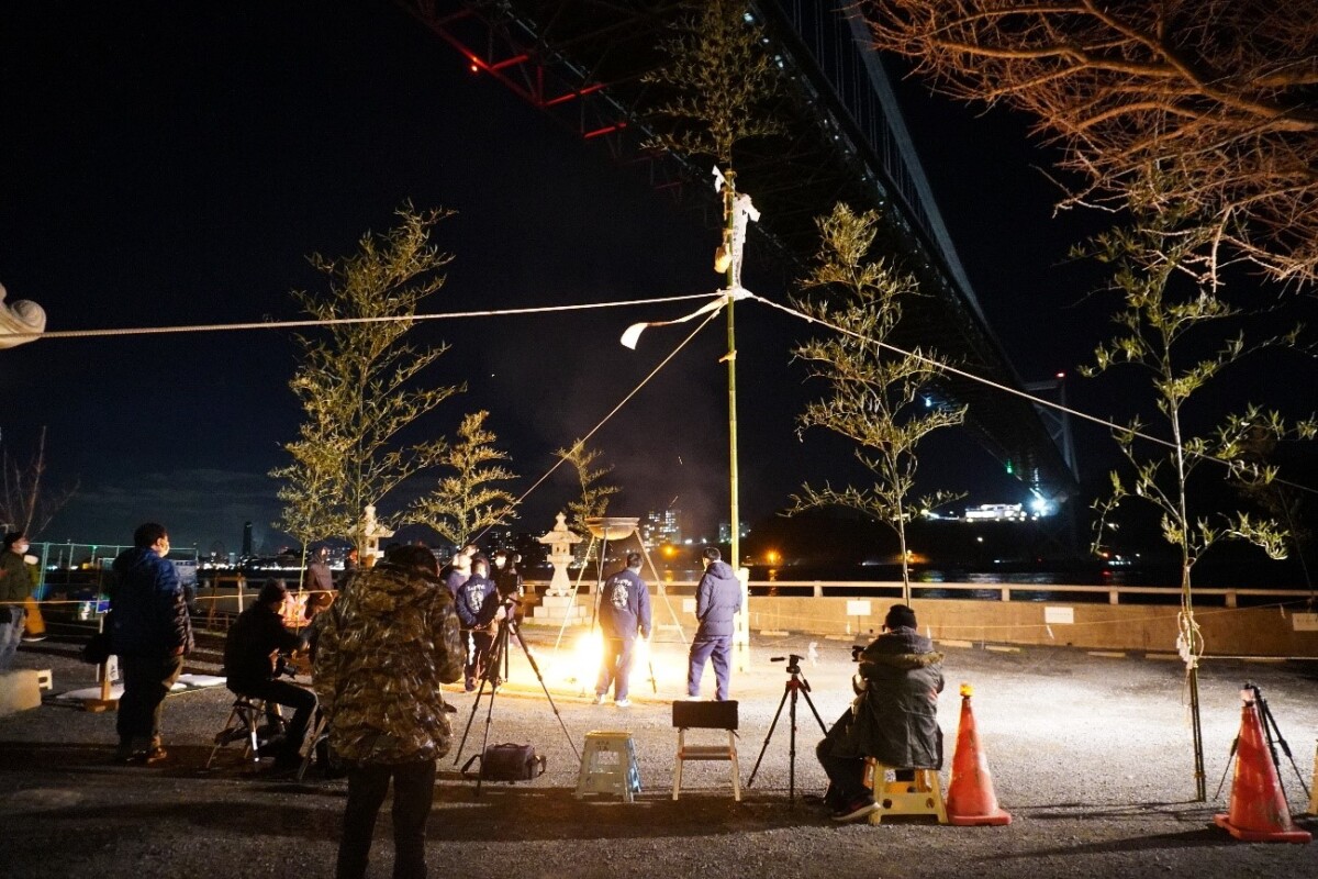 夜の関門海峡、そして上空には関門橋が大きく掛かっている和布刈神社は、このダイナミックな演目を行うには絶好の場所です。暗い海を行き交う船と汽笛に誰もが情緒たっぷりと浸かり、神楽舞の世界に引き込まれていくことでしょう。