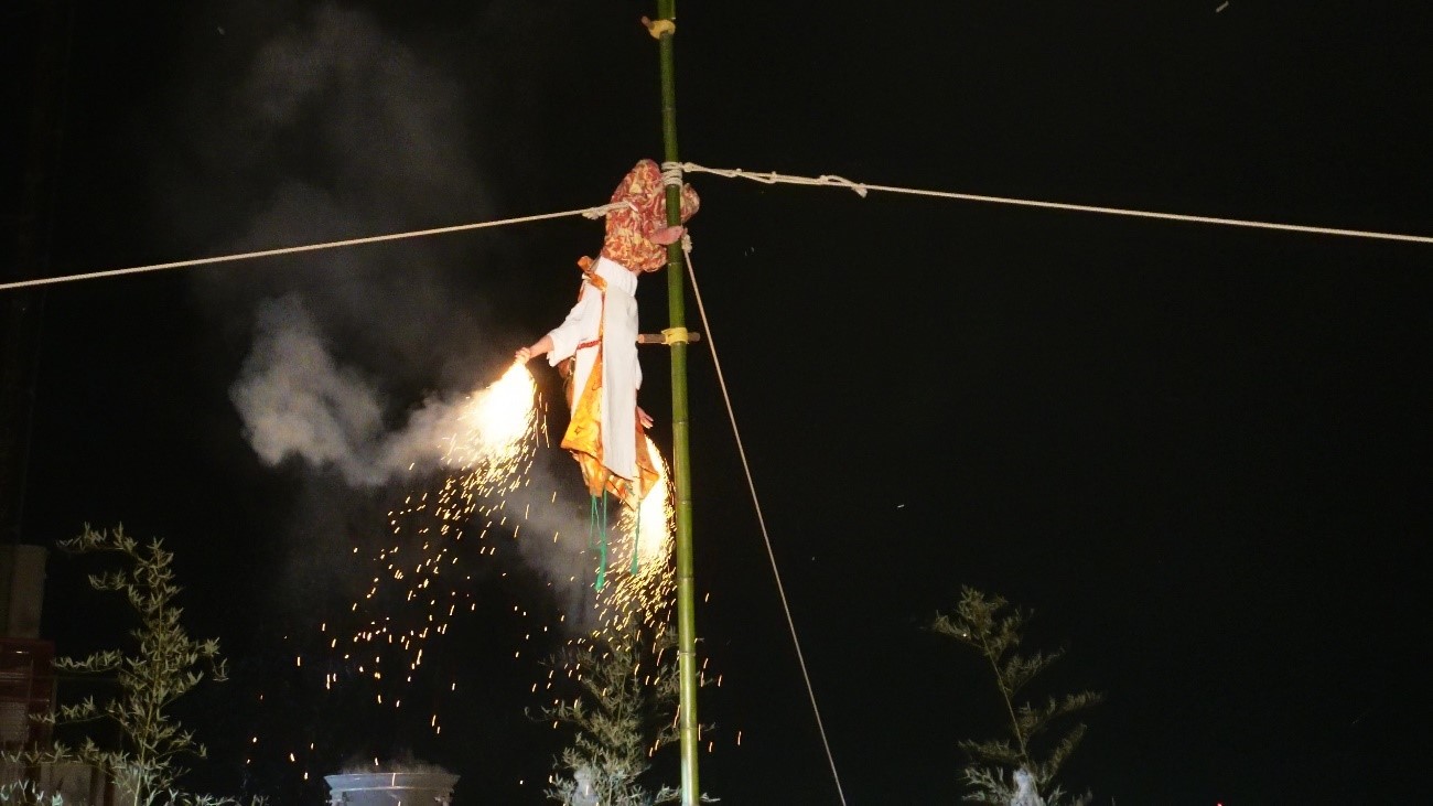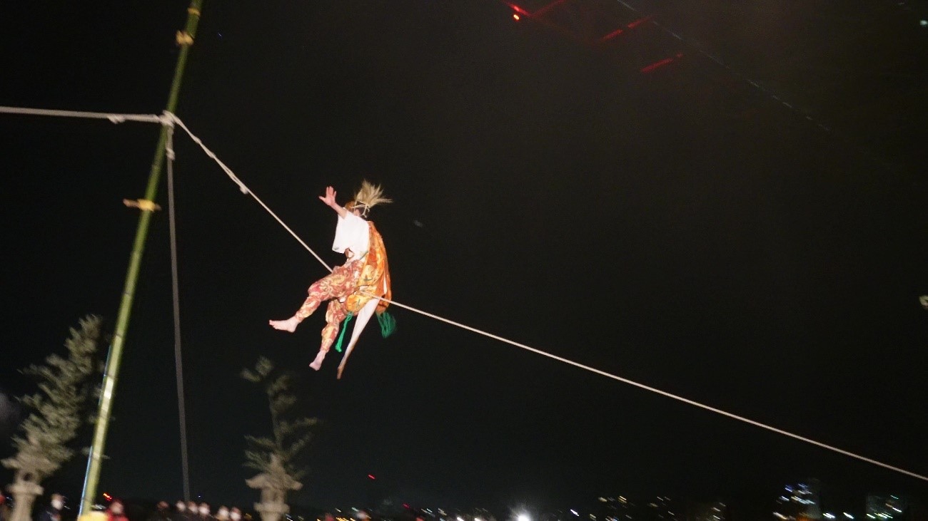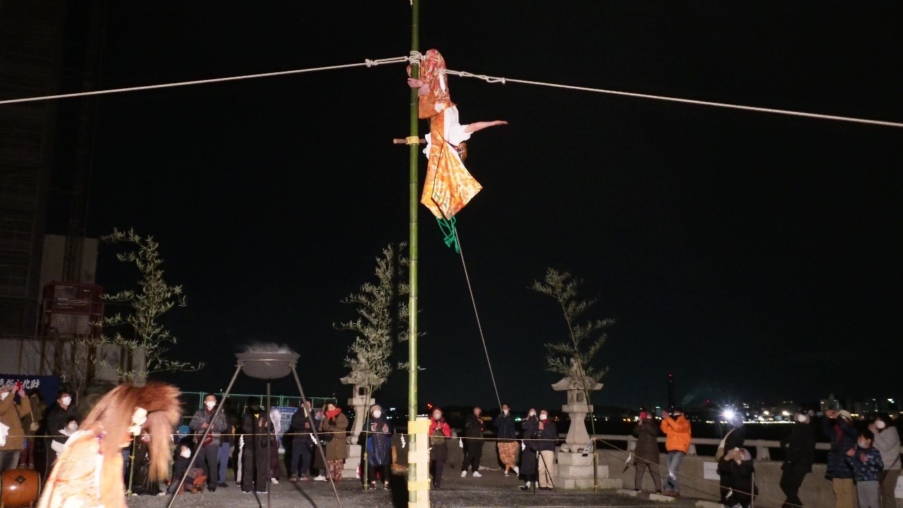 鬼面の猿田彦がするすると竹を上り、曲芸のようなしぐさで舞う姿はハラハラドキドキ。