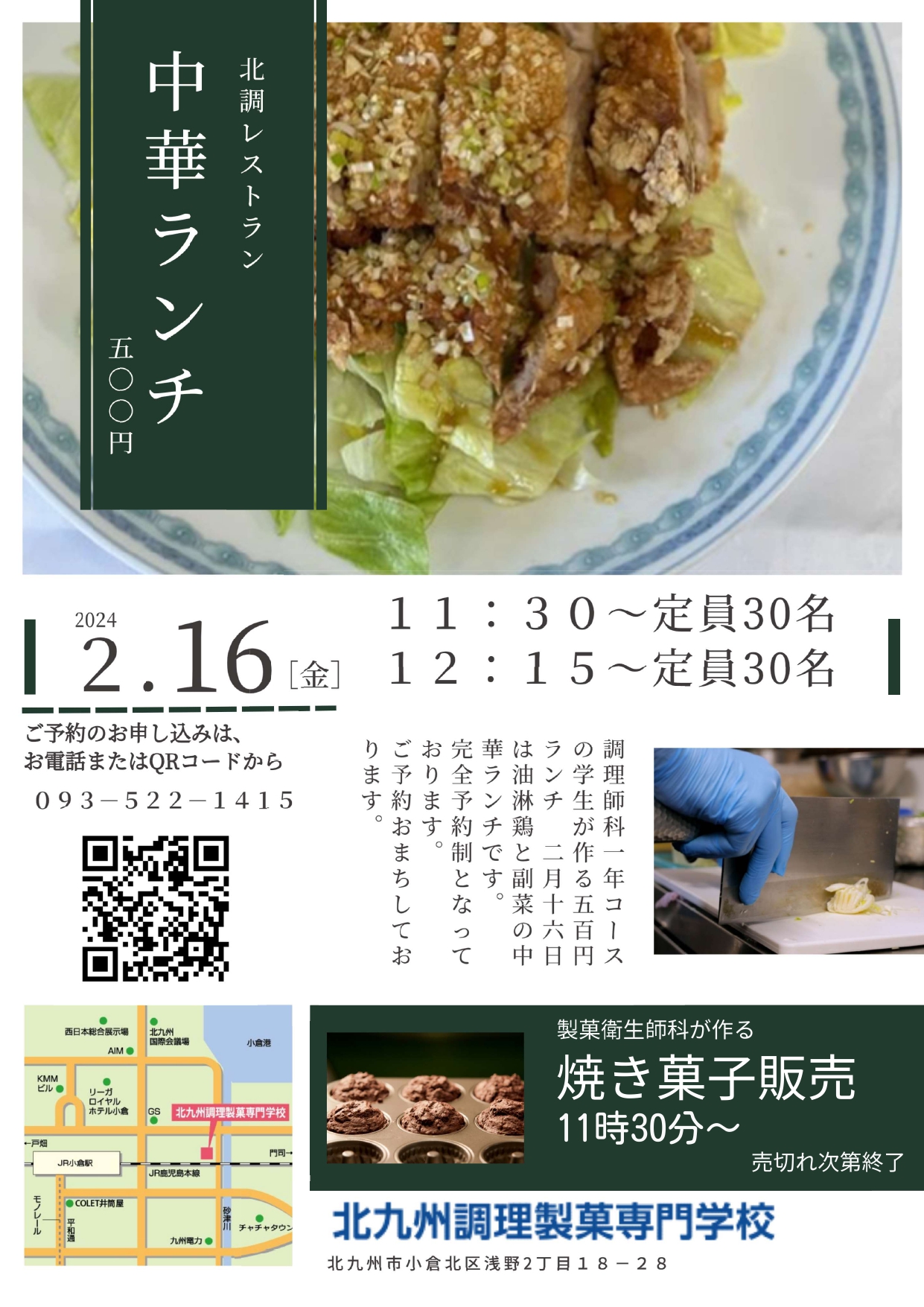 北調レストランが2月16日限定でオープンします。午前11時30分~・午後12時15分~の予約制となっています。今回は「中華ランチ」油淋鶏と副菜の500円ランチです。「焼き菓子販売」も同時開催です。午前11時30分~でこちらはなくなり次第終了です。 皆様のご予約(093-522-1415/平日:午前9時~午後5時)とご来校をお待ちしております。
