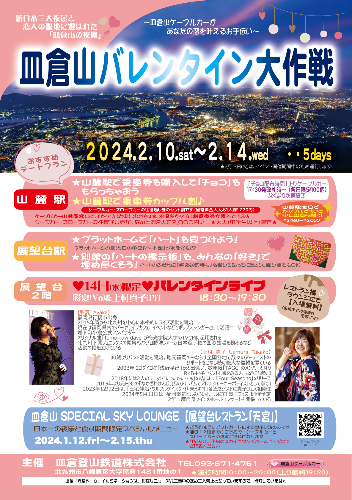 皿倉山でのおすすめデートプランのご紹介です。2024年2月10日~2月14日の5日間、「皿倉山バレンタイン大作戦」を開催します。2月14日の午後6時30分~午後7時30分には、展望台2階ラウンジで夜景を眺めながら楽しめる生演奏もあります。