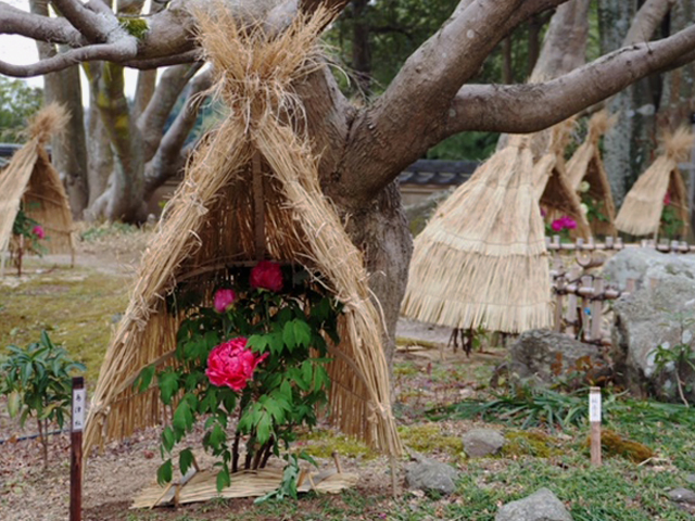 寒さ除けのための藁囲いかぶった冬牡丹が冬の庭園を彩ります。入口広場からぼたん園にかけて、赤や白、黄色の色とりどりの冬牡丹が並びます。 冬牡丹とは春に咲く牡丹を温度調節により、冬に開花させたものです。冬ならではの贅沢な風情をおたのしみください。
