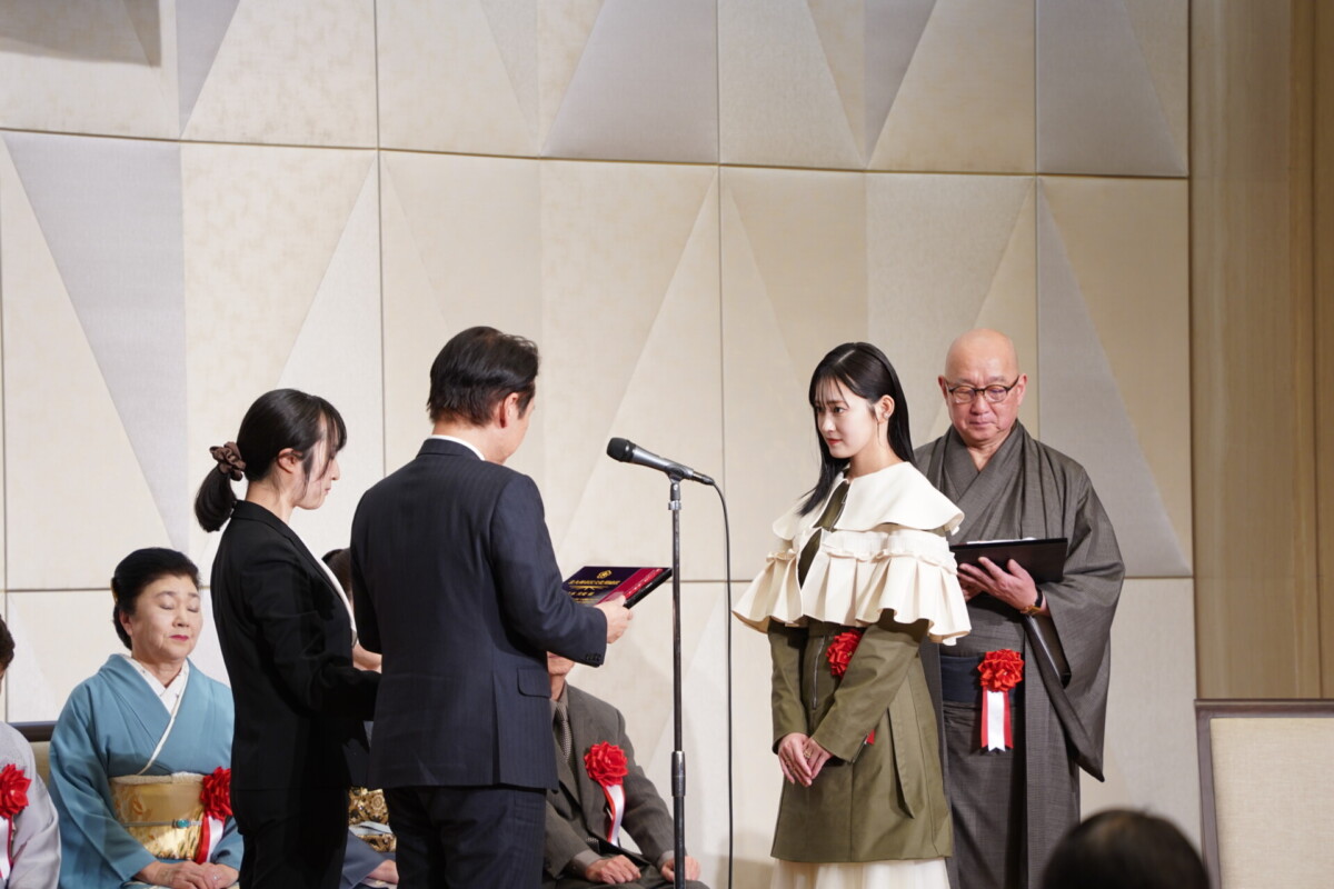 開会の言葉や市歌斉唱のあと、受賞者の紹介。市民文化賞受賞の天野功一さん、続いて市民文化奨励賞受賞の吉本実憂さんが壇上にあがりました。市民文化賞を受賞した俳優の草刈正雄さんは、スケジュールの都合で欠席でした。