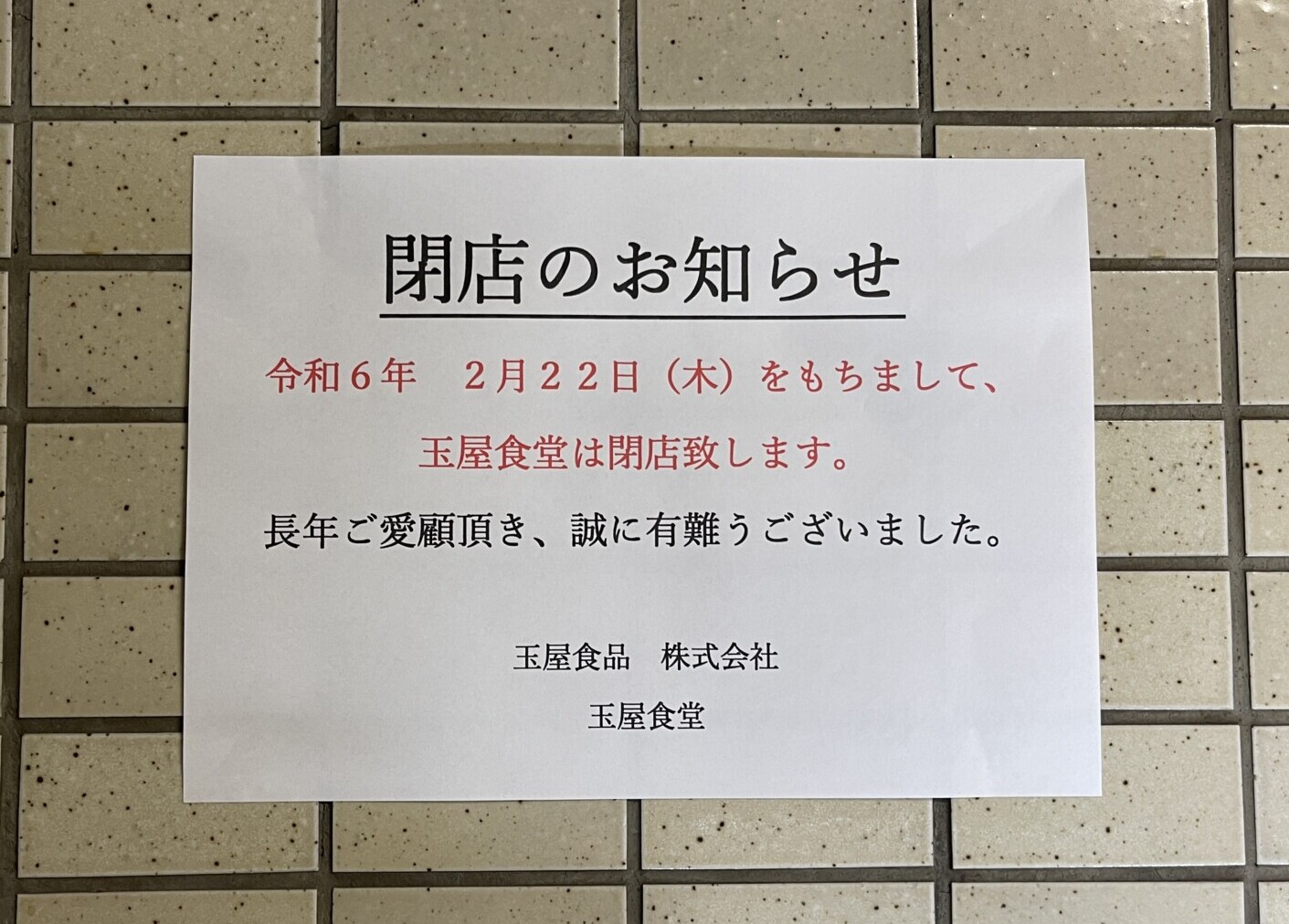 店頭に貼られたお知らせには、「長年ご愛顧頂き、誠に有難うございました」と書かれています。
